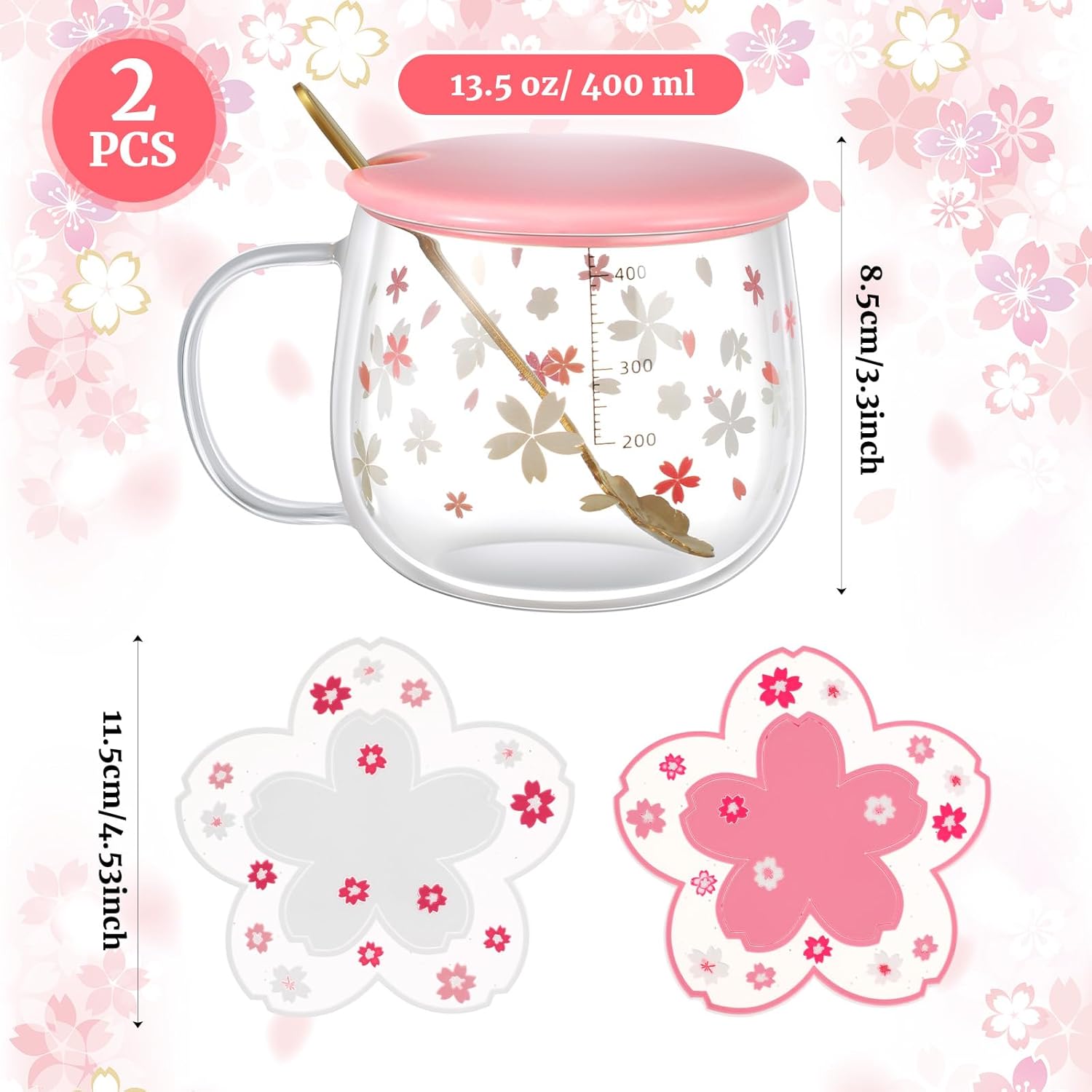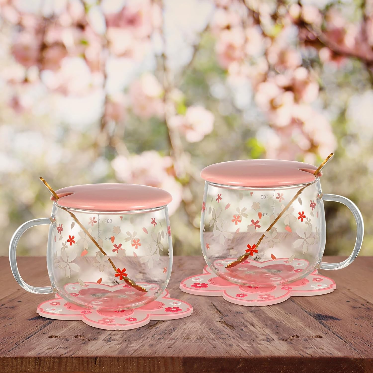 🌸 Set de Tazas Sakura de Vidrio Grueso + Posavasos (x2) ☕✨