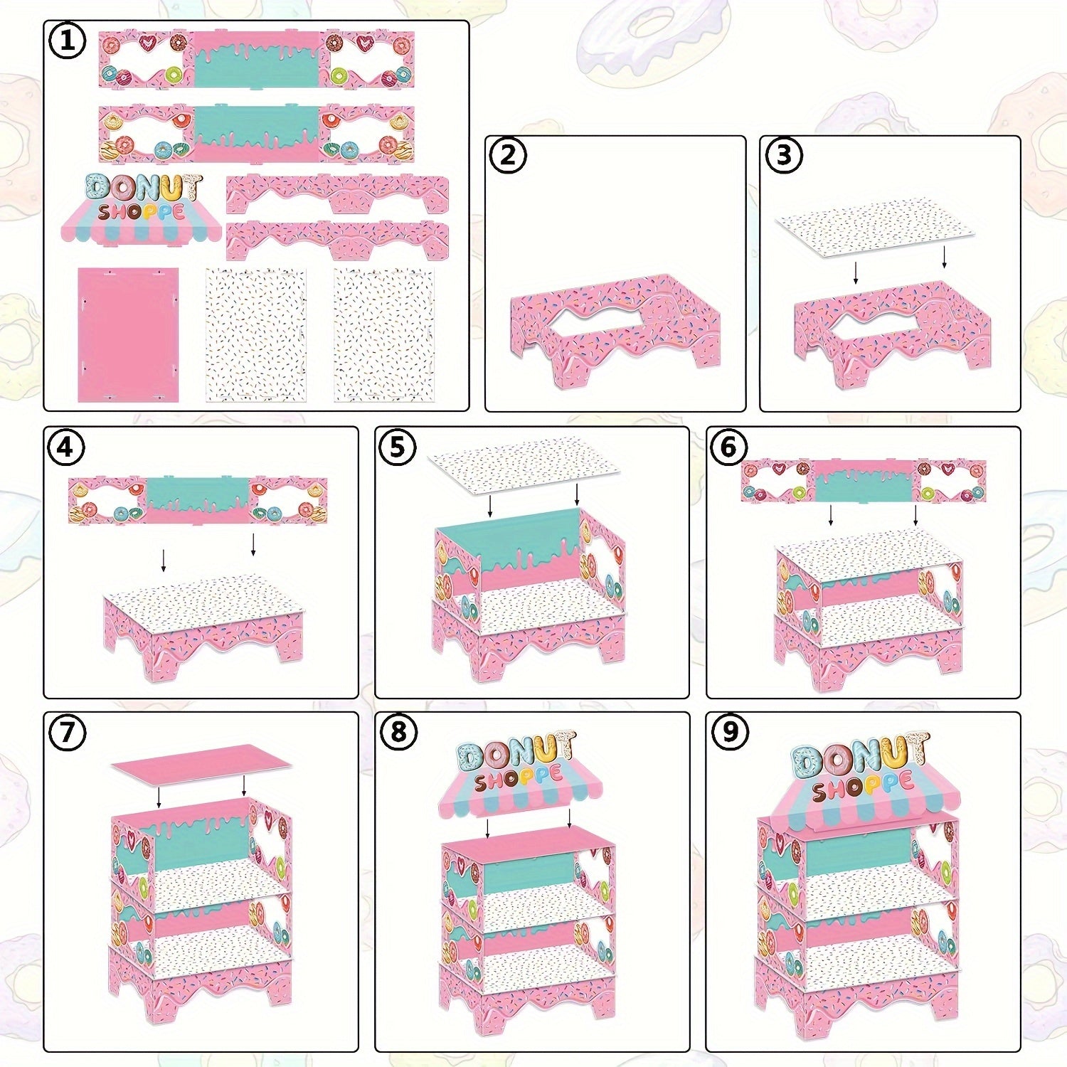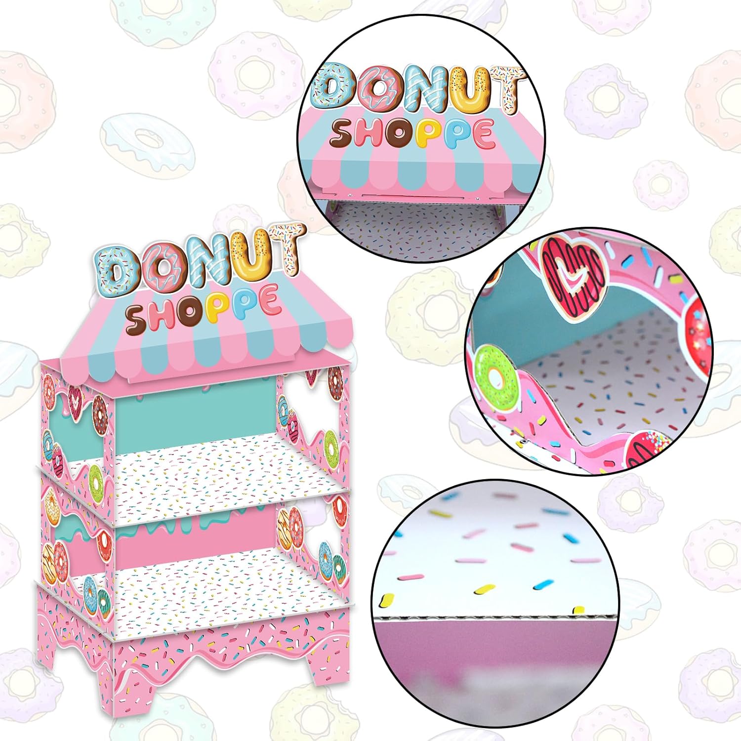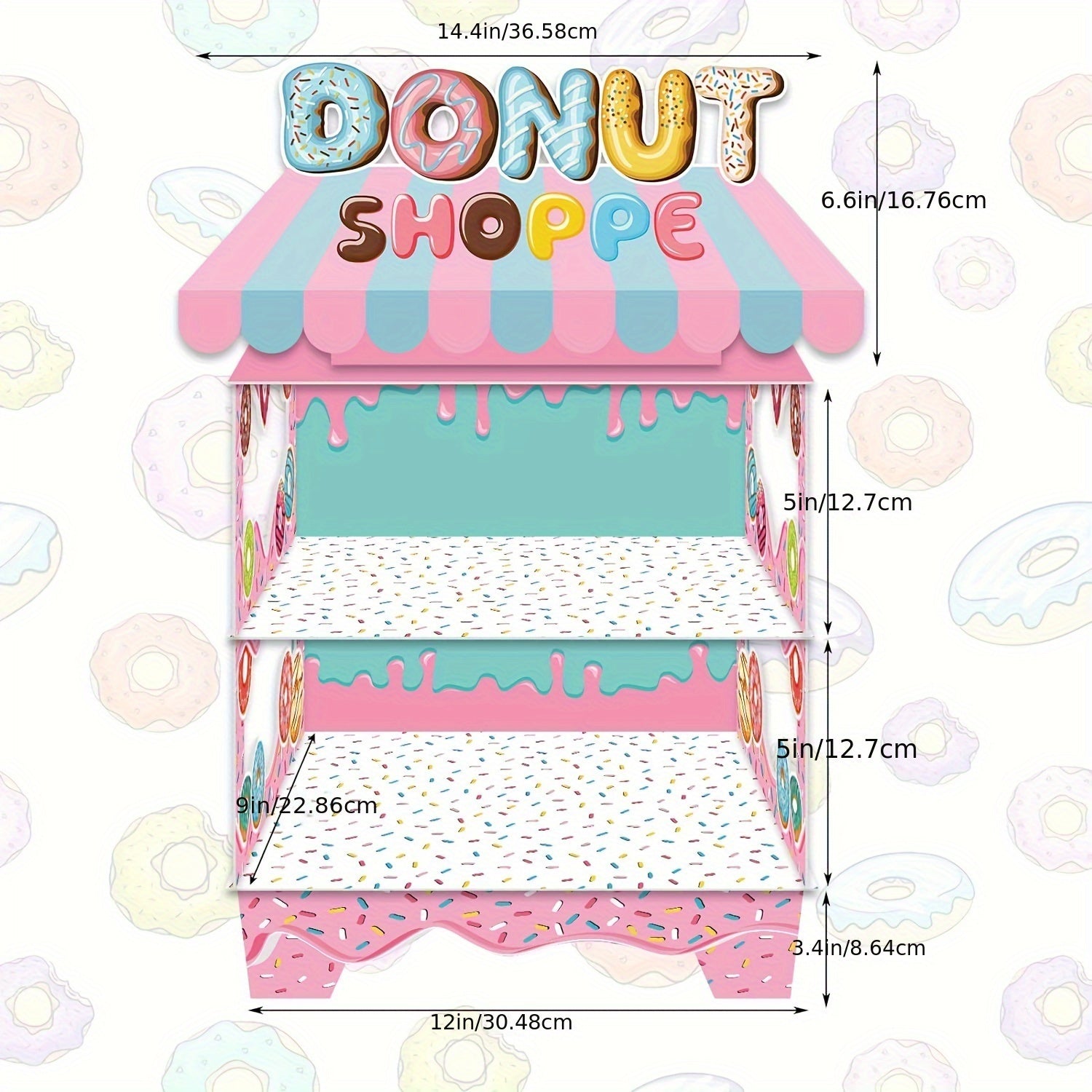 Este soporte de cartón con diseño de dona rosa es ideal para presentar cupcakes, mini postres o decoraciones temáticas. Su estructura de tres niveles lo convierte en el punto focal perfecto para tu fiesta.