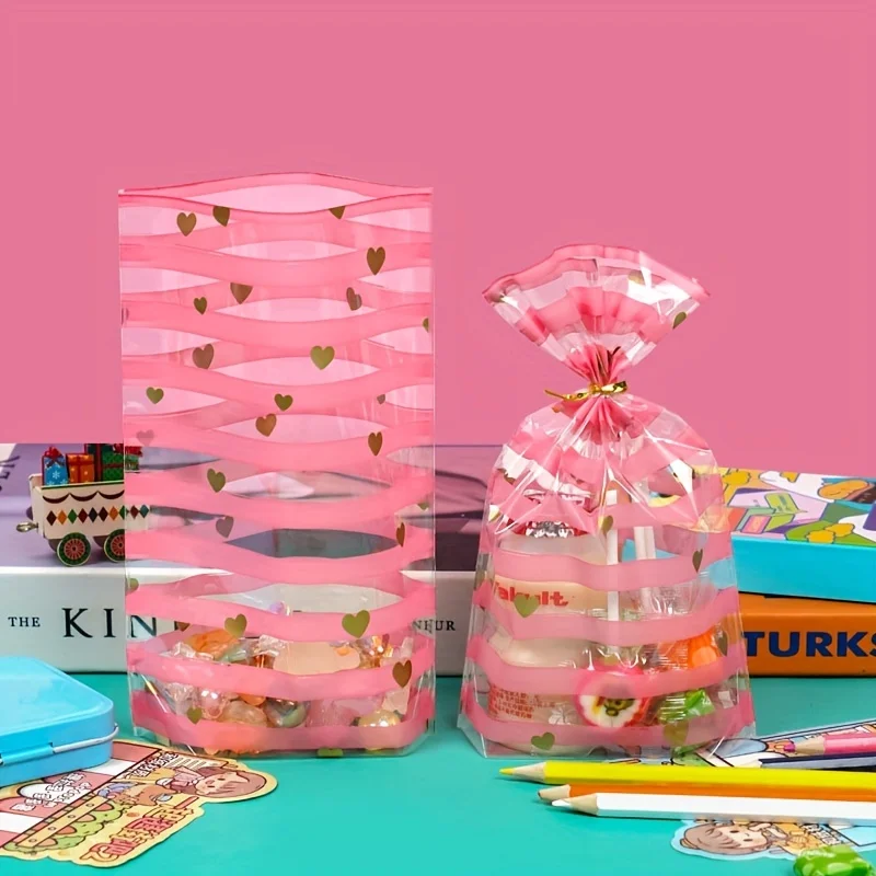 Las bolsas de celofán con rayas y corazones no solo son funcionales, sino también encantadoras, impresionando a tus invitados con un empaque llamativo y bien diseñado.