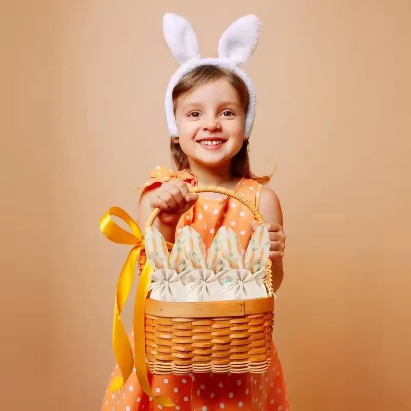Adorables bolsas de yute con diseño de conejito y zanahorias. Con un tamaño práctico y un diseño único, estas bolsas son ideales para dulces, pequeños obsequios y recuerdos especiales en cualquier evento temático de primavera.
