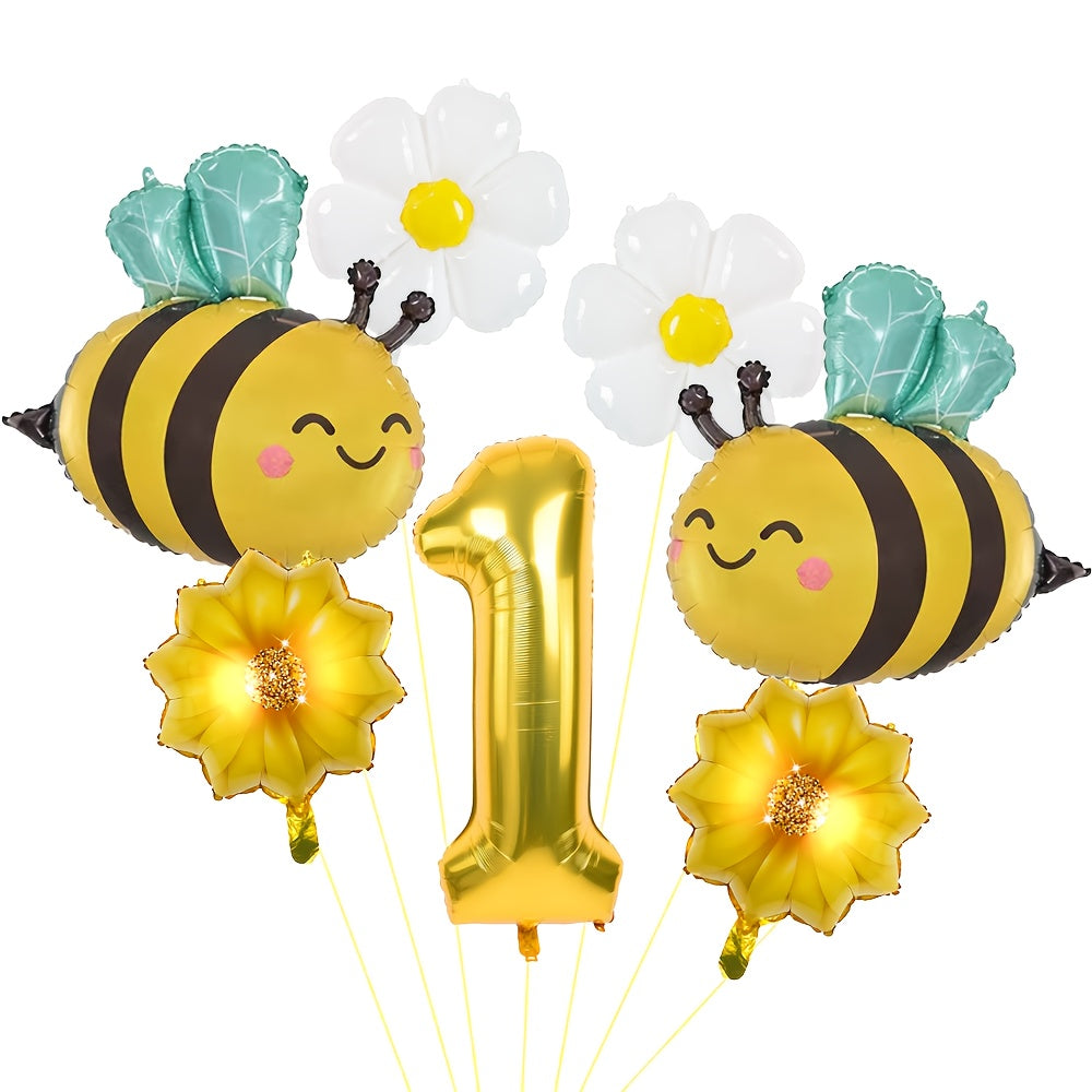 Set de 7 globos de aluminio tipo Mylar incluye abejitas sonrientes, margaritas blancas y números dorados para personalizar cualquier cumpleaños, fiesta en el jardín o decoración festiva. Perfecto para baby showers, eventos escolares, Halloween, Navidad y mucho más.