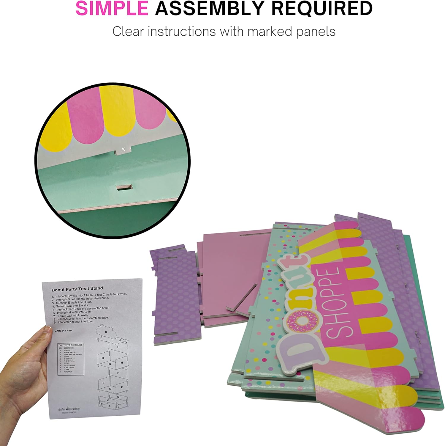 Duplica el nivel, duplica el encanto. Este soporte blanco de cartón incluye 2 niveles para exhibir donas, cupcakes o pequeños regalos. Su diseño vertical y elegante lo convierte en el centro de mesa perfecto para cualquier celebración dulce.