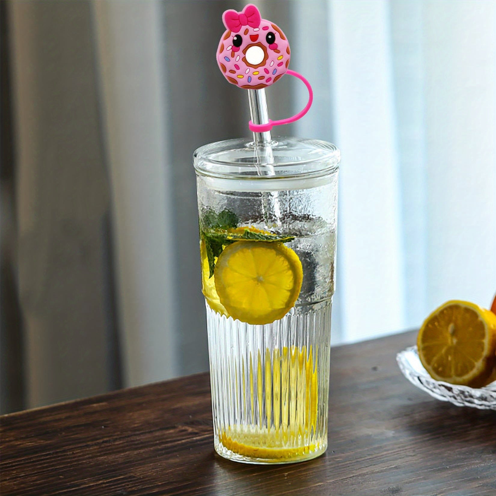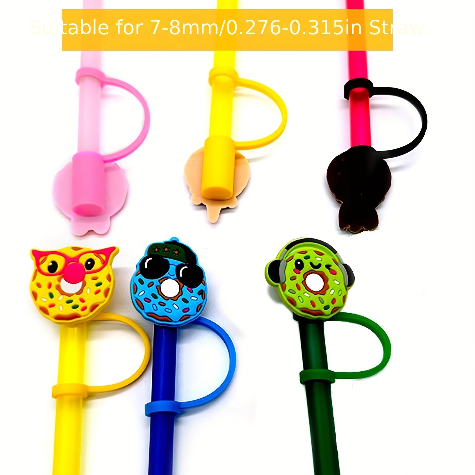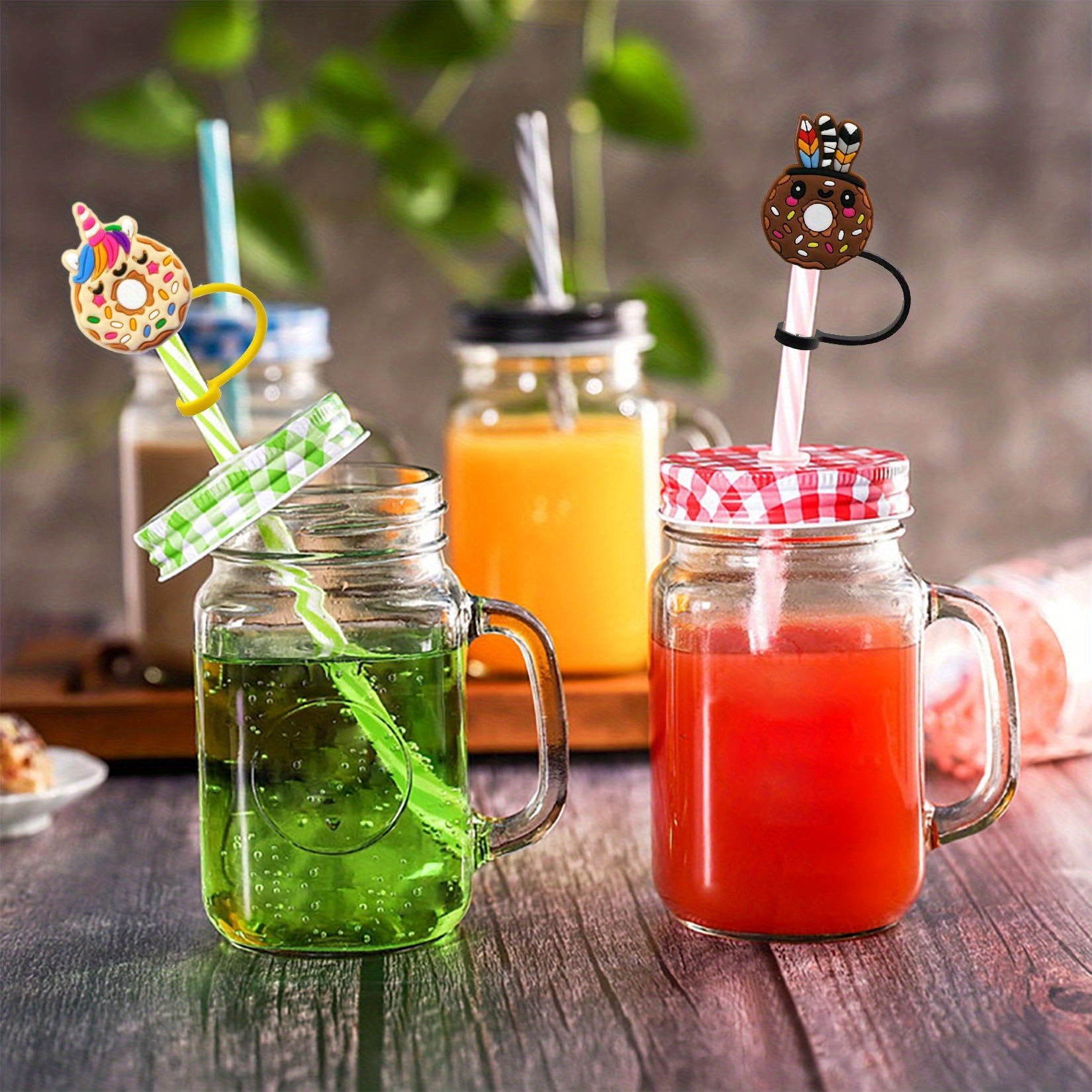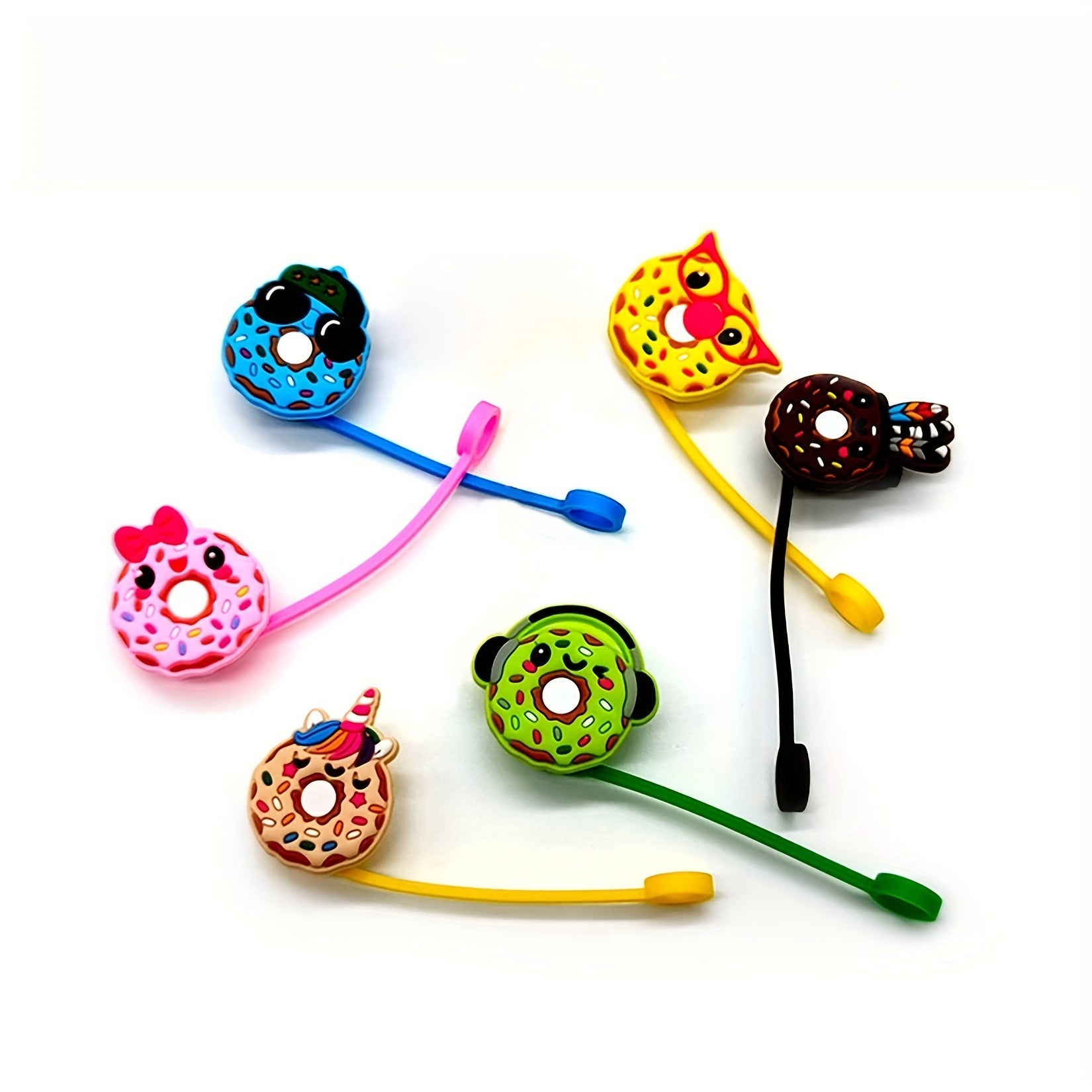Protege con estilo y dulzura. Este set incluye tapitas de silicona con diseño de dona tipo caricatura, ideales para cubrir pajitas en fiestas temÔticas, evitando polvo y derrames mientras decoras con encanto.