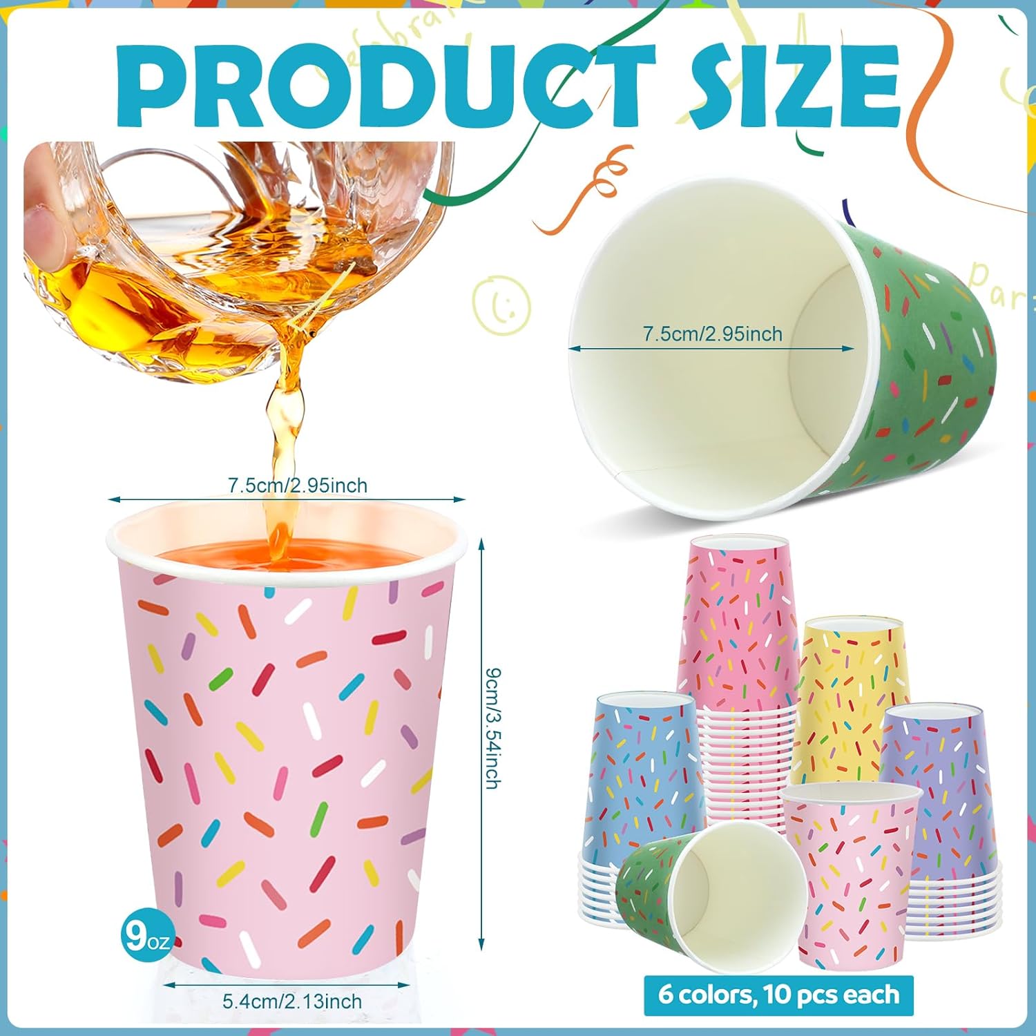 Sirve con estilo y alegría. Este set incluye 60 vasos desechables en 6 colores vibrantes con diseño de confeti de donas, perfectos para bebidas frías, helados o decoración de mesa en fiestas temáticas.