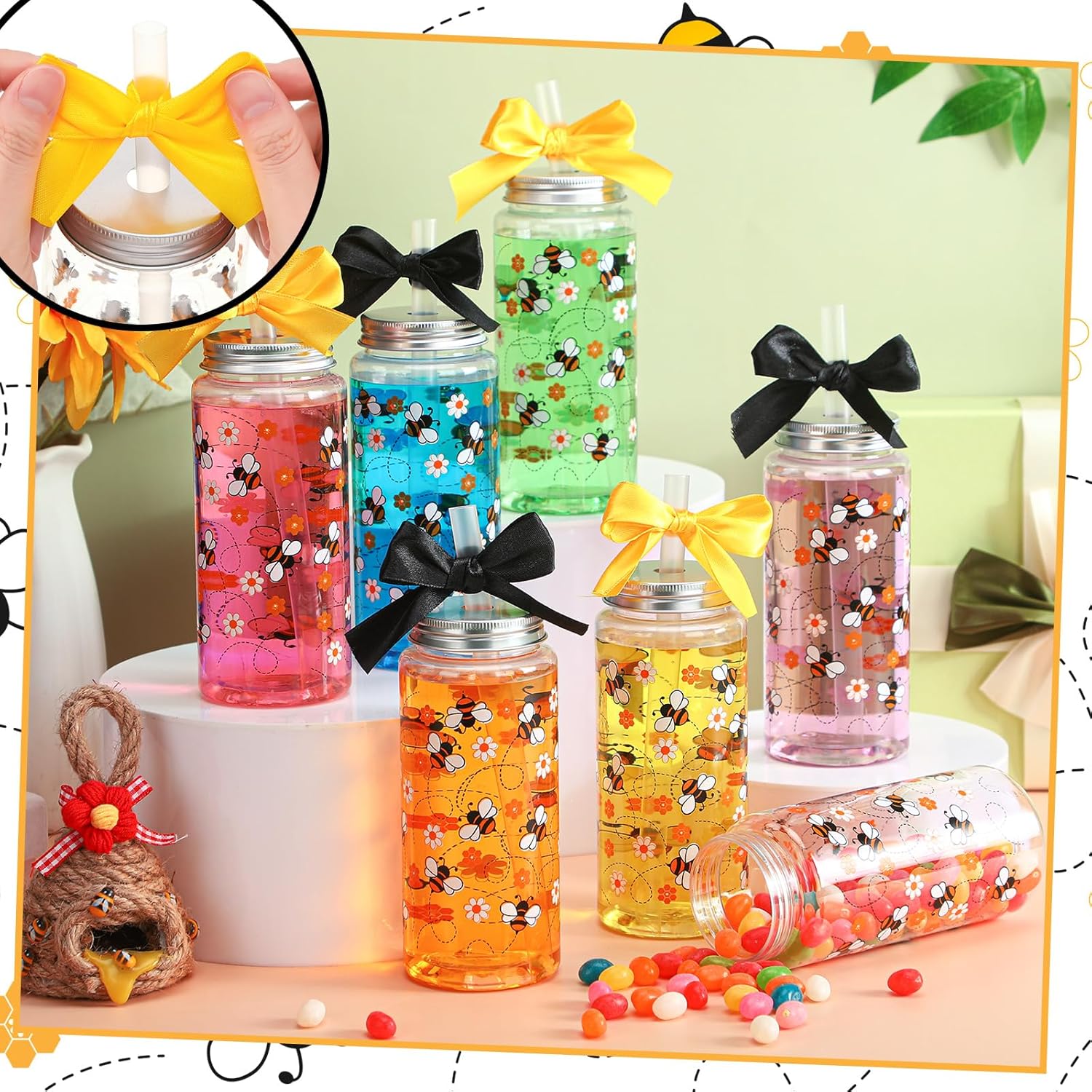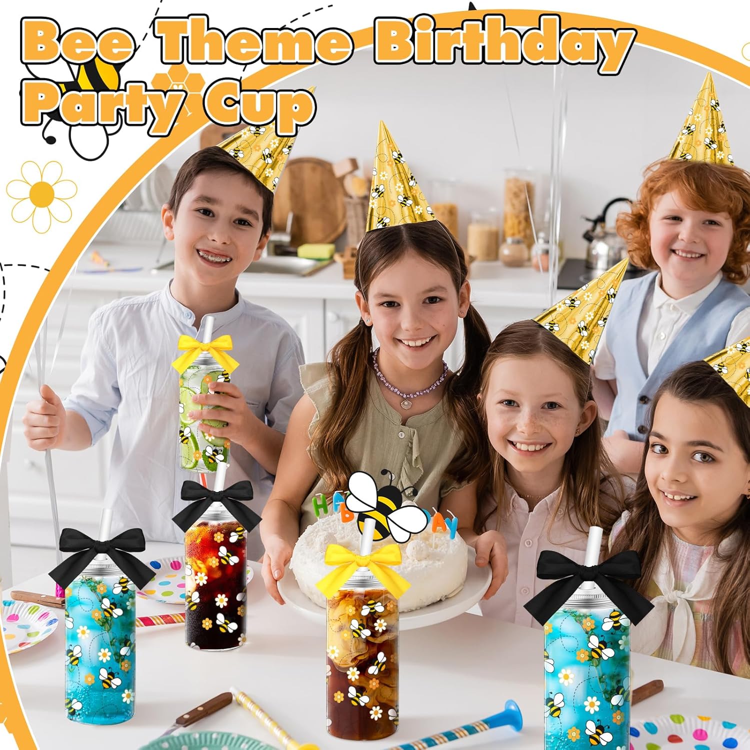 Sirve tus bebidas con encanto temático. Este set incluye 12 vasos reutilizables de 14 oz con tapas, sorbetes y dos rollos de cinta decorativa en amarillo y negro. Perfectos para decorar mesas o preparar regalos personalizados.